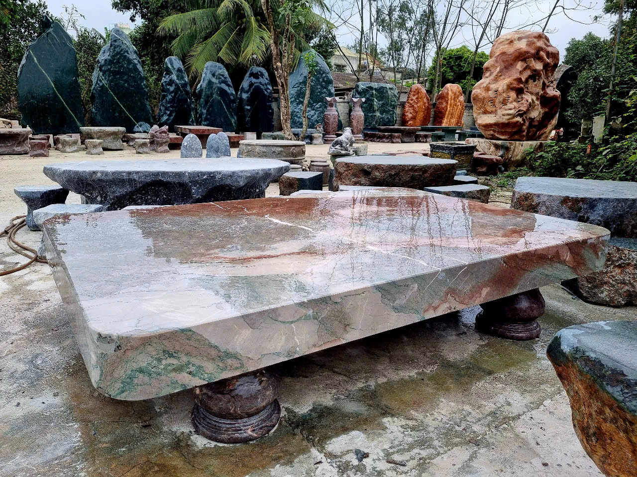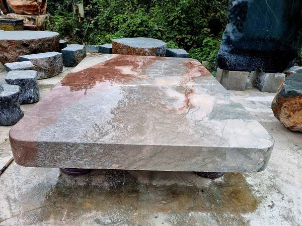 Bộ bàn ghế đá tự nhiên, bàn ghế đá nguyên khối, Bộ bàn ghế đá sập quỳ đá đỏ vân rồng nguyên khối