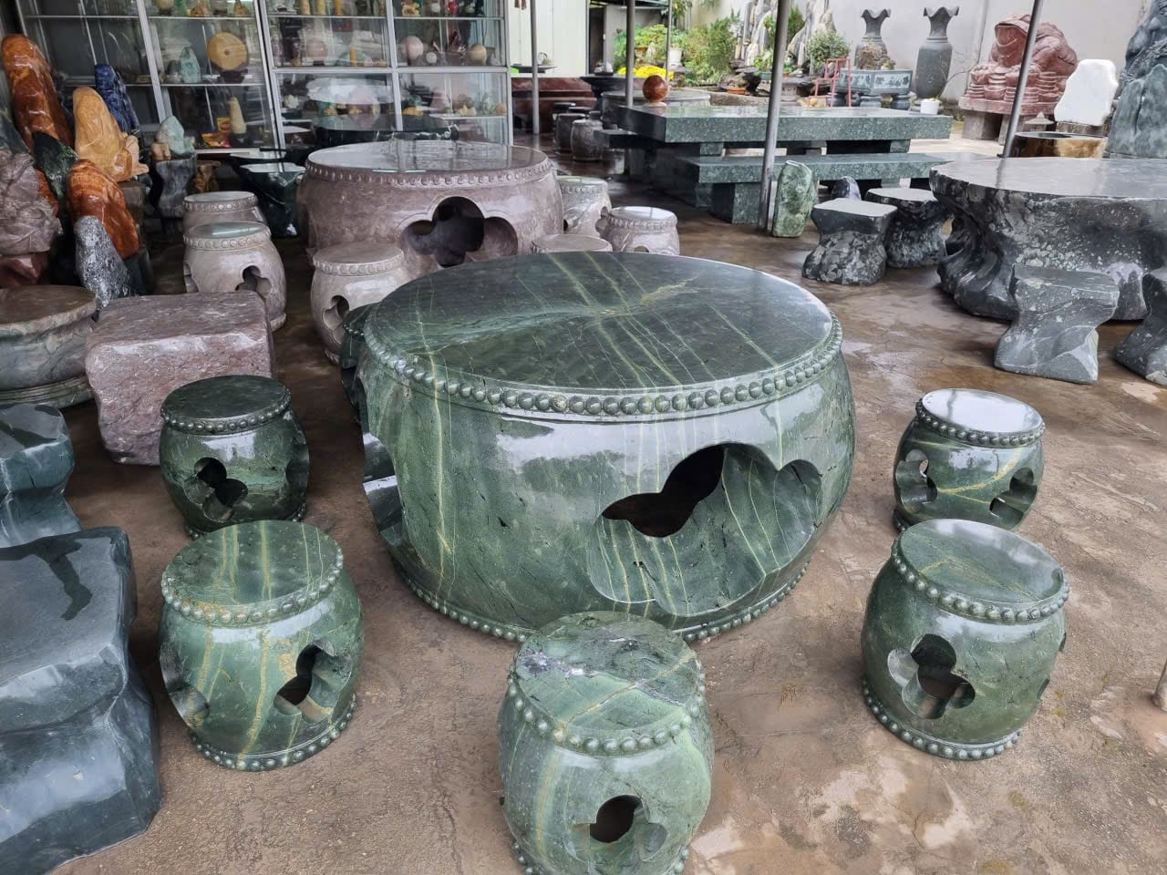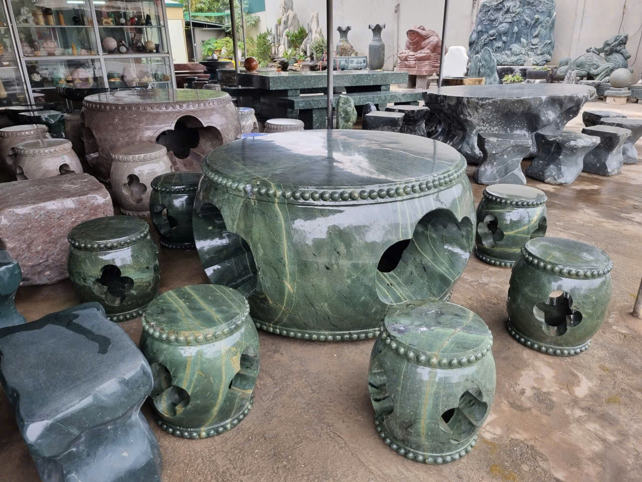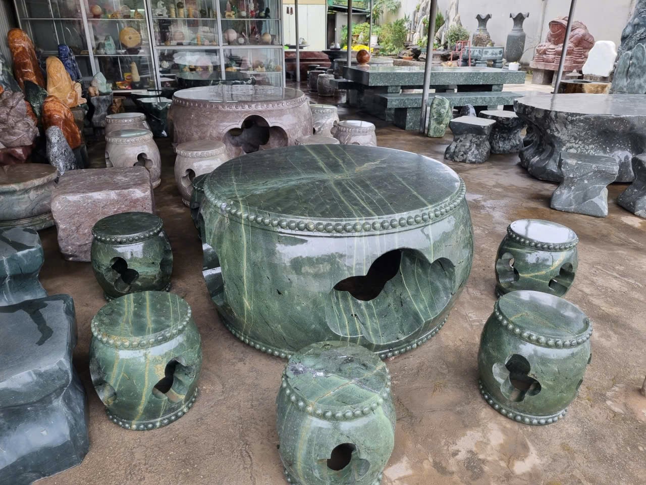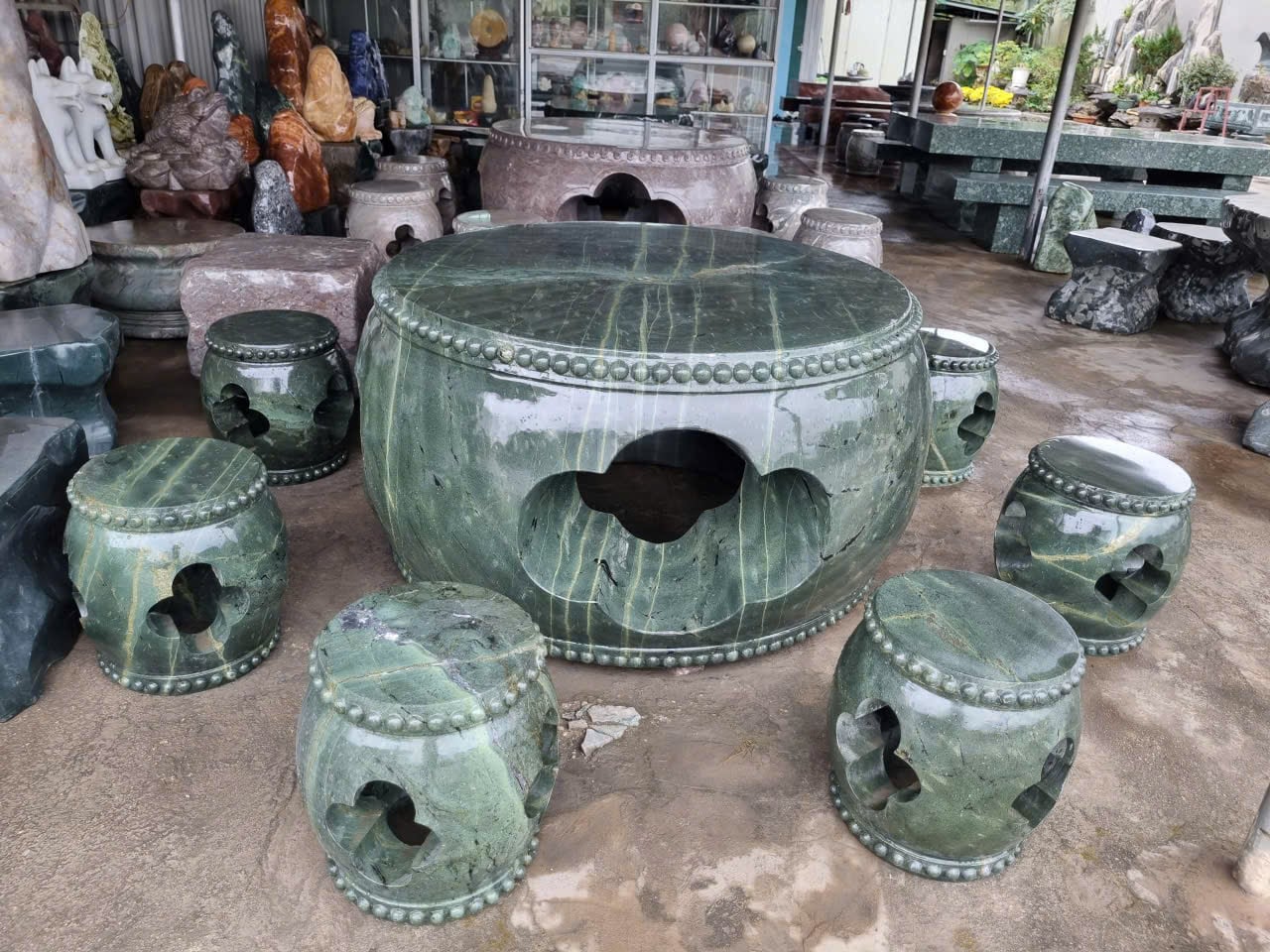 Bộ bàn ghế đá tự nhiên, bàn ghế đá nguyên khối, Bộ bàn ghế đá trống chất đá cẩm thạch xanh nguyên khối