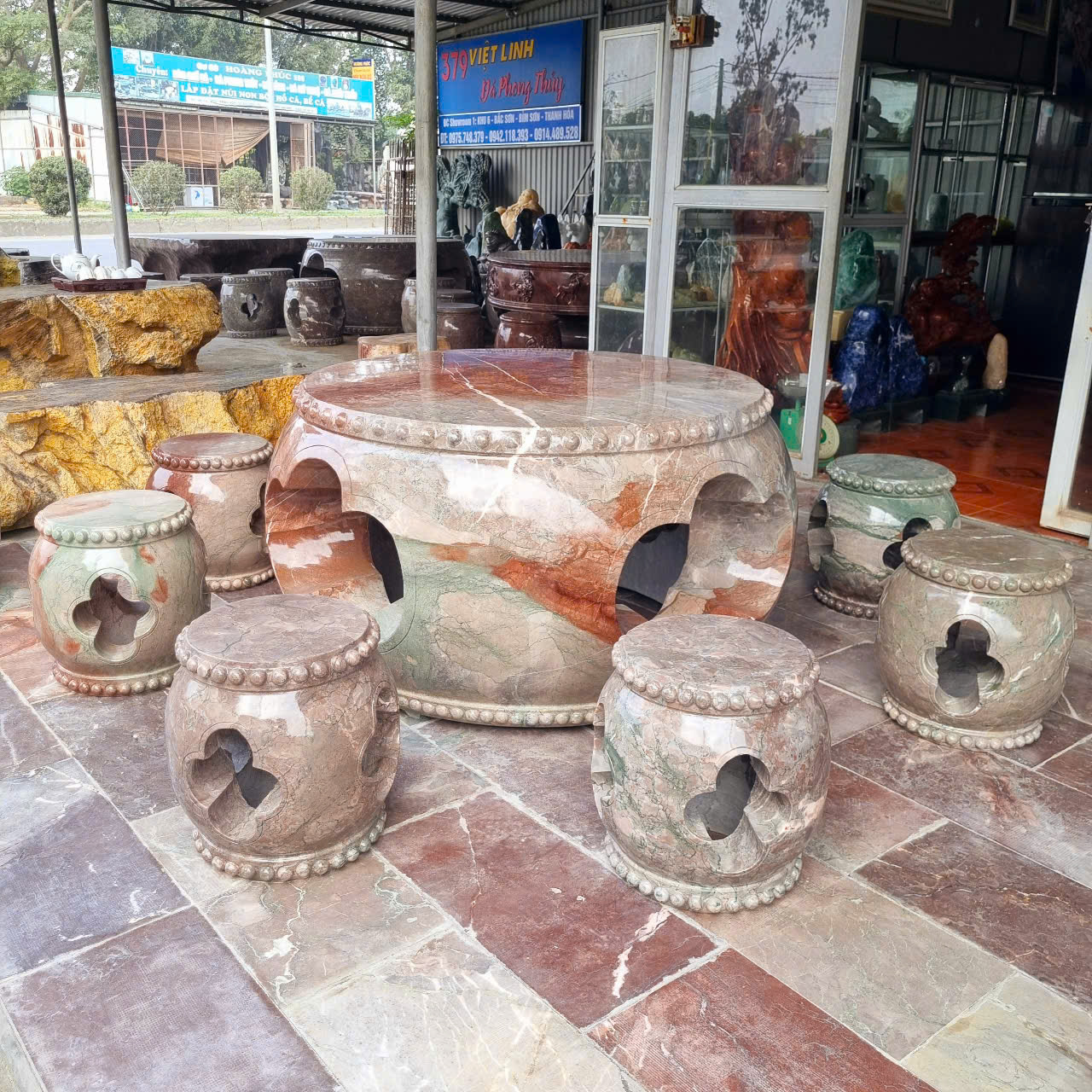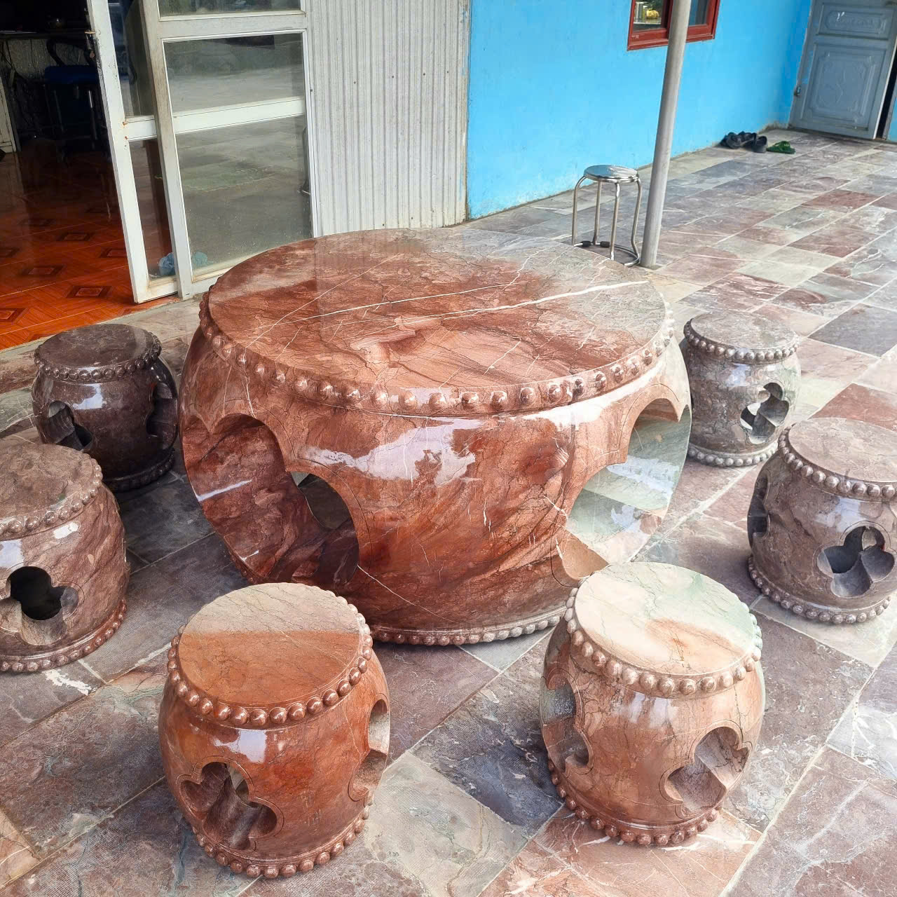 Bộ bàn ghế đá tự nhiên, bàn ghế đá nguyên khối, Bộ bàn ghế đá trống chất đá đỏ vân rồng nguyên khối