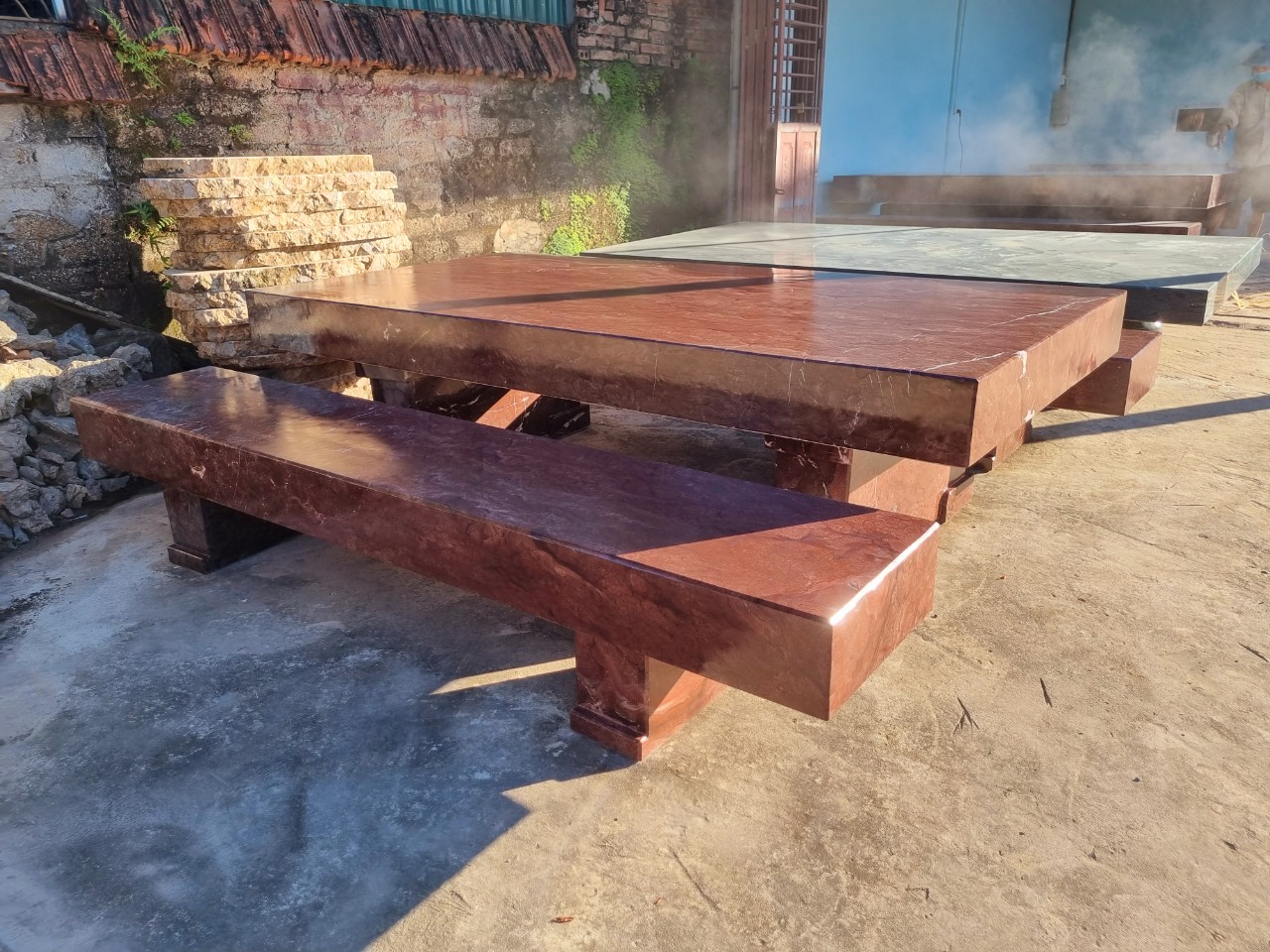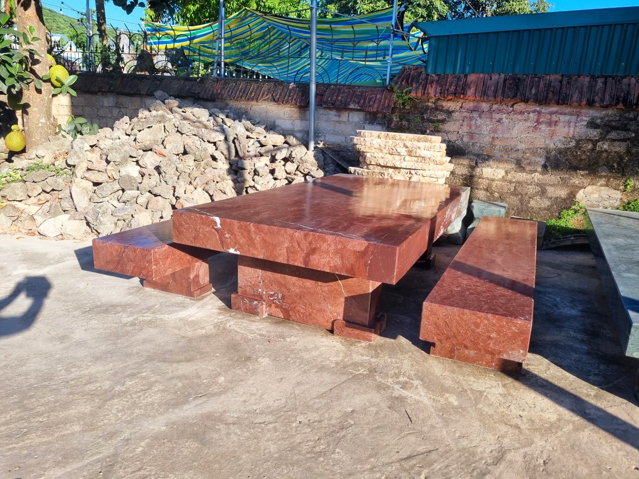 Bộ bàn ghế đá tự nhiên Bộ bàn ghế băng chất đá đỏ vân rồng