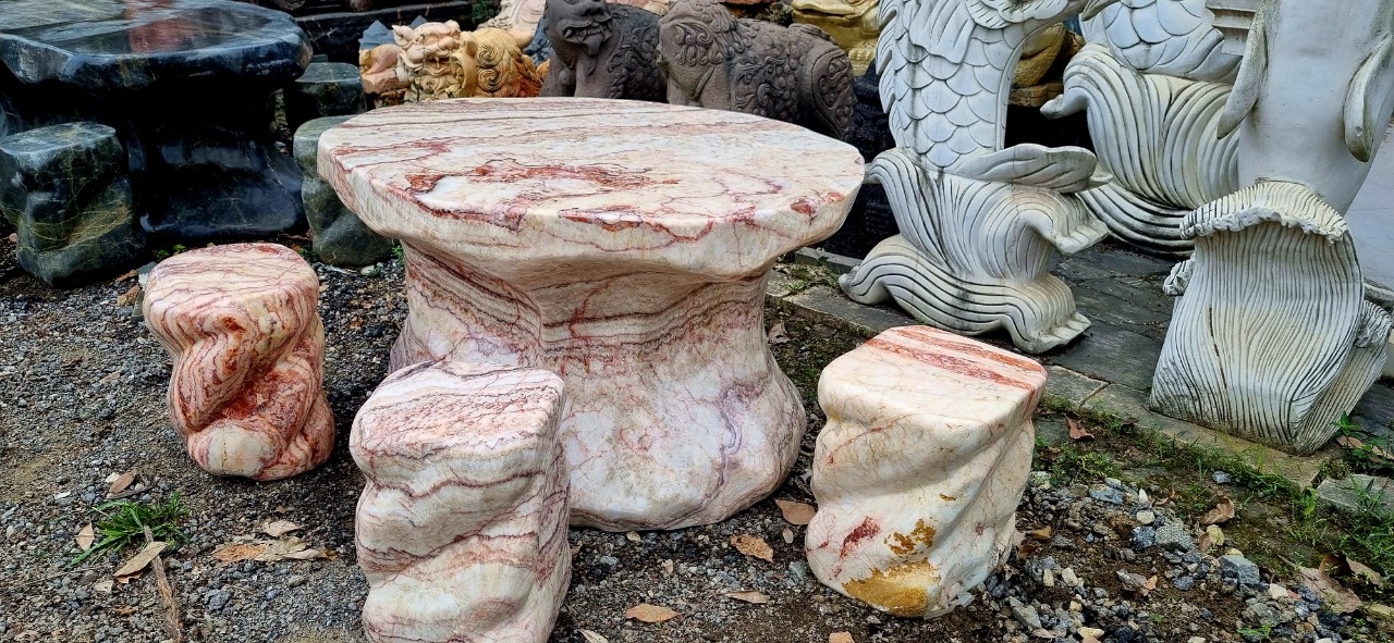Bộ bàn ghế đá tự nhiên, đá nguyên khối, Bộ bàn đá thổ cẩm vân hồng gồm 6 ghế