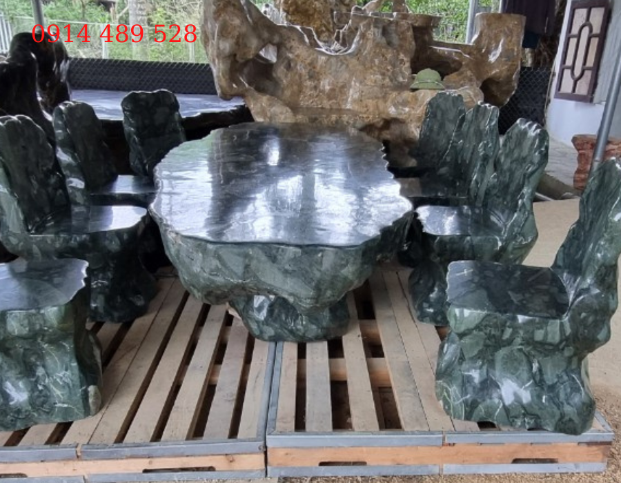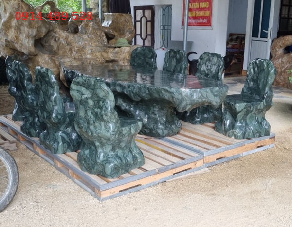 Kích thước (cm): Bộ bàn ghế đá xanh cẩm thạch dài 2m60 rộng 1m cao 65 cm, có thể đặt theo yêu cầu